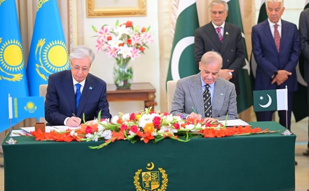 اسلام آباد:پاکستان اور قازقستان کے درمیان تجارت، سرمایہ کاری، توانائی،تعلیم،کھیل، ریلوے، مصنوعی ذہانت و ڈیجیٹل ترقی اور صحت سمیت مختلف شعبوں میں تعاون کے فروغ کےلئے مفاہمت کی متعدد یادداشتوں اورمعاہدوں پر دستخط کر دیئے گئے ہیں ،وزیراعظم محمد شہباز شریف نے کہا ہے کہ پاکستان اور قازقستان کے درمیان تجارتی حجم میں اضافے کے بہت مواقع ہیں، ایک سال میں دو طرفہ تجارت کو ایک ارب ڈالر تک لے جانے کا ہدف ہے، مشترکہ کوششوں سے اقتصادی اور تجارتی تعاون کے اہداف حاصل کریں گے ، مختلف شعبوں میں تعاون کے معاہدے اور مفاہمتی یادداشتیں دو طرفہ تعلقات کو وسعت دینے کے عزم کی عکاس ہیں، سٹریٹجک شراکت داری کا معاہدہ انتہائی اہمیت کا حامل ہے،دونوں ممالک غزہ بورڈ آف پیس کے بھی رکن ہیں ، دعاگو ہیں کہ غزہ میں مستقل امن اورخوشحالی آئے جبکہ قازقستان کے صدر قاسم جومارت توکایووف نے کہا ہے کہ پاکستان قازقستان کا قابل اعتماد دوست او ر سٹریٹجک شراکت دار ہے، دونو ں ممالک کے درمیان تجارت و معیشت سمیت مختلف شعبوں میں تعاون کو فروغ مل رہا ہے، ایک ارب ڈالر کا تجارتی ہدف حاصل کرنے کےلئے مل کر آگے بڑھیں گے،خطے میں امن و استحکام کےلئے پاکستان کی کاوشیں قابل تعریف ہیں،دفاع کے شعبے میں بھی پاکستان کی ترقی عالمی سطح پر تسلیم کی جاتی ہے، پاکستان کے ساتھ مختلف شعبوں میں تعاون بڑھانے کےلئے پرعزم ہیں، پاکستانی سرمایہ کاروں کوکاروبار کےلئے پرکشش مواقع فراہم کریں گے۔